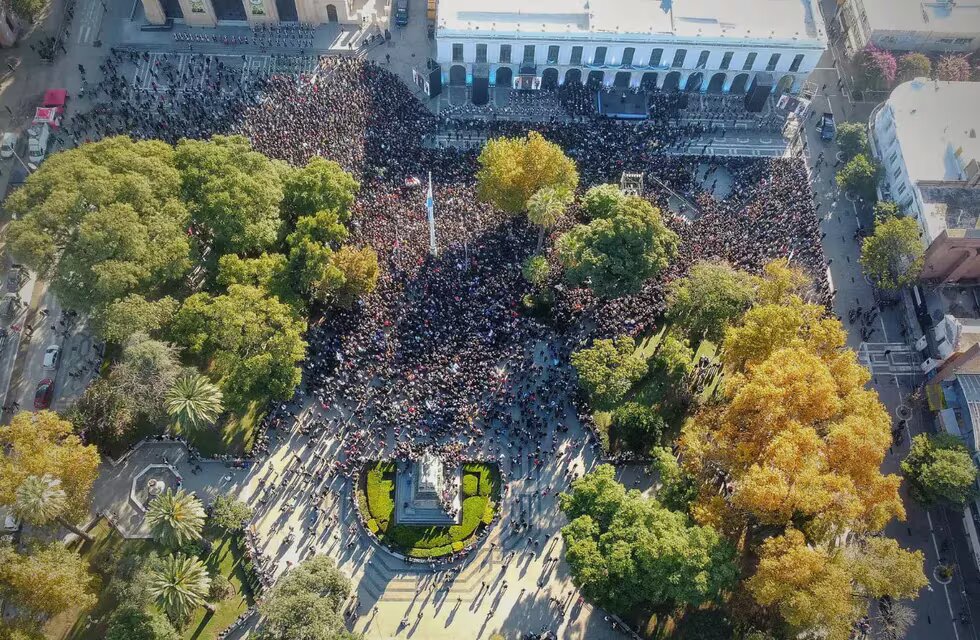 Los drones que filmaron el acto mostraron una postal lejana a la de otros eventos (como el cierre de campaña de Milei en noviembre del año pasado). Los 40.000 metros cuadrados de la San Martín estaban cubiertos solo en un tercio, en la zona junto al Cabildo.